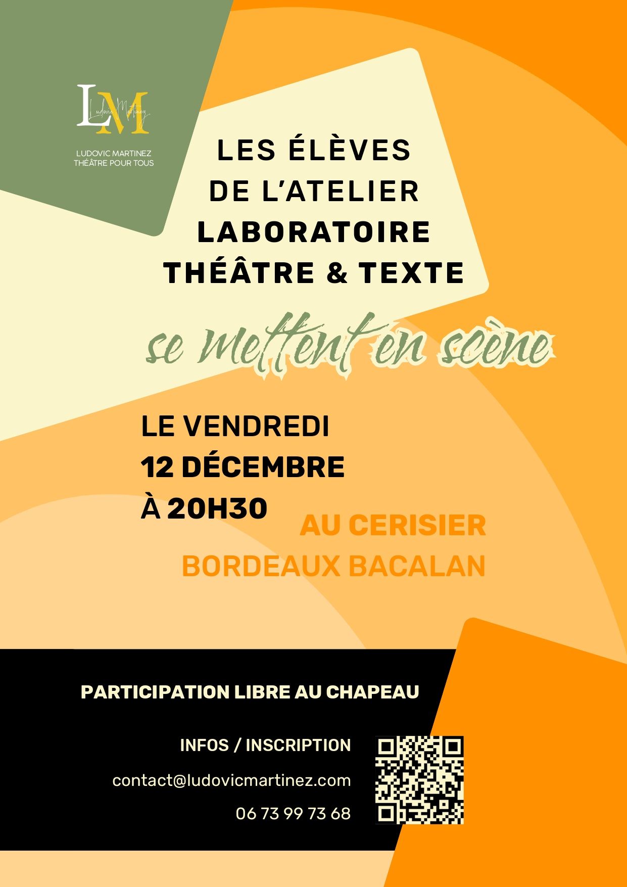 L’atelier laboratoire des coursLudovicMartinezse met en scène ! Pour marquer la fin du premier trimestre, les élèves comédiens vous invitent à découvrir les textes qu’ils ont choisis : théâtre, roman, écriture personnelle, ou encore formes plus inattendues. Laissez-vous embarquer ! Au fil des séances, chacun a apprivoisé son texte, y a glissé un peu de lui-même, jusqu’à en faire une création singulière. Ce moment sur scène est le fruit d’un vrai parcours de comédien ; où l’exploration chemine vers un jeu sincère et plein de fantaisie.
